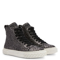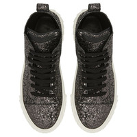 Product Details High-top sneakers crafted from anthracite-grey synthetic glitter fabric with white cotton laces, featuring a tone-on-tone 'Label Signature' on the tongue; the eye-catching rubber 3D 'Blabber' sole gives the design a perfect finish. Glitter anthracite-grey synthetic fabric (54% RPET; 1% PET; 35% PL; 10% PU) Tone-on-tone 'Label Signature' on the tongue Tone-on-tone 'Label Signature' on the tongue Rubber sole with logo Made in Italy