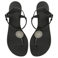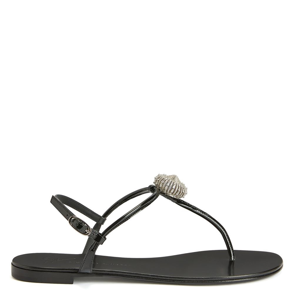 Product Details Flat thong sandals crafted from patent-effect black synthetic fabric with matching laminated leather sole, thin straps, an adjustable ankle strap with a small metal side buckle and embellished with a silver metal accessory with crystal rhinestones. Patent-effect black synthetic fabric Silver metal hardware with crystal rhinestones Adjustable ankle strap with silver metal buckle 10 mm heel Glossy black leather sole with logo Made in Italy