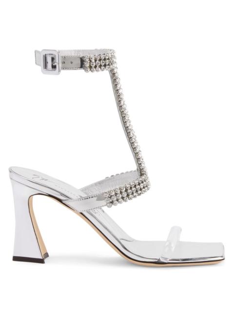 Product Details These sandals are crafted from light-blue, mirror-effect synthetic fabric and feature clear PVC straps embellished with a silver metal accessory with crystal rhinestones, an adjustable ankle strap crossed on the back of the heel with a small buckle and matching covered stiletto heels. Clear PVC Adjustable strap in light-blue, mirror-effect synthetic fabric (43% PU; 30% PES; 19% TPU; 8% LAMINA) Silver metal chain with crystal rhinestones 105 mm heel covered in light-blue, mirror-effect synthetic fabric (43% PU; 30% PES; 19% TPU; 8% LAMINA) Leather sole with logo Made in Italy