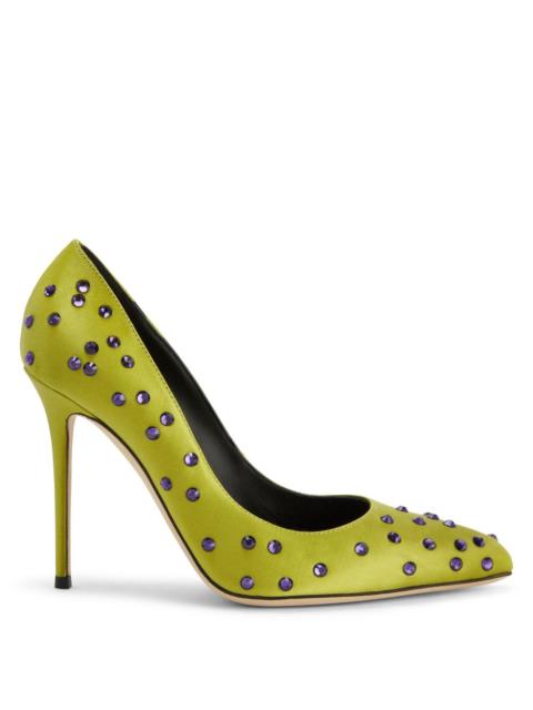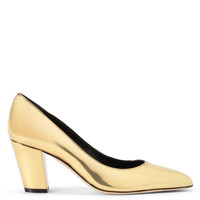 Product Details These pointed-toe pumps are crafted from mirror-effect golden synthetic fabric and feature a classic silhouette; matching covered chunky heels and black leather soles give the design a perfect finish. Mirror-effect golden synthetic fabric 70 mm heel Mirror-effect golden synthetic fabric covered heel Leather sole with logo Made in Italy
