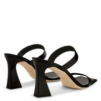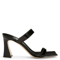 Product Details Double-band sandals in patent-effect fabric with square toe and spool heel. - Black patent-effect synthetic fabric - 85 mm high heel covered in black patent-effect synthetic fabric - Leather sole with logo - Made in Italy - Reflective golden synthetic fabric - 85 mm high heel covered in reflective golden synthetic fabric - Leather sole with logo ORIGIN: ITALY COLOR: BLACK