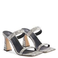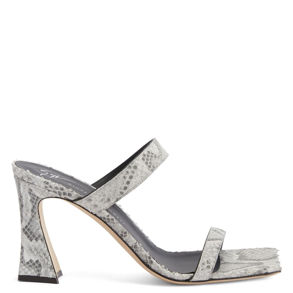 Product Details These mules, crafted from rock-grey python-print leather, feature two straps and matching covered spool heels and are characterised by a square toe and a leather sole with logo. Rock-grey python-print leather and black leather trims Heel covered in rock-grey python-print leather 85 mm heel Leather sole with logo Origin Italy Color Grey More Minus