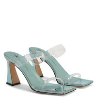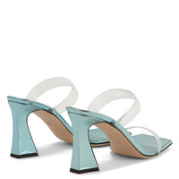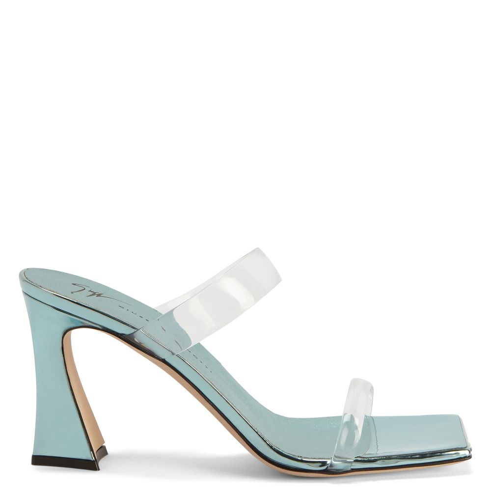 Product Details Mules crafted from mirror-effect light-blue synthetic fabric with matching leather soles, featuring a square toe, clear PVC straps and matching spool heels. Clear PVC 85 mm heel Heel covered in mirror-effect light-blue synthetic fabric Leather sole with logo Made in Italy