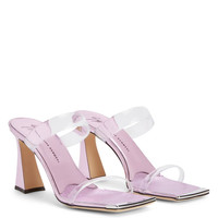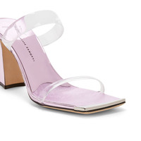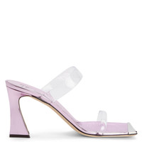 Product Details Mules crafted from pink mirror-effect synthetic fabric with matching leather sole, featuring a square toe embellished with a silver metal accessory, clear PVC straps and matching spool heels. Clear PVC Silver metal accessory on the tip 85 mm heel Heel covered in pink mirror-effect synthetic fabric (43% PU; 30% PES; 19% TPU; 8% LAMINA) Leather sole with logo Made in Italy