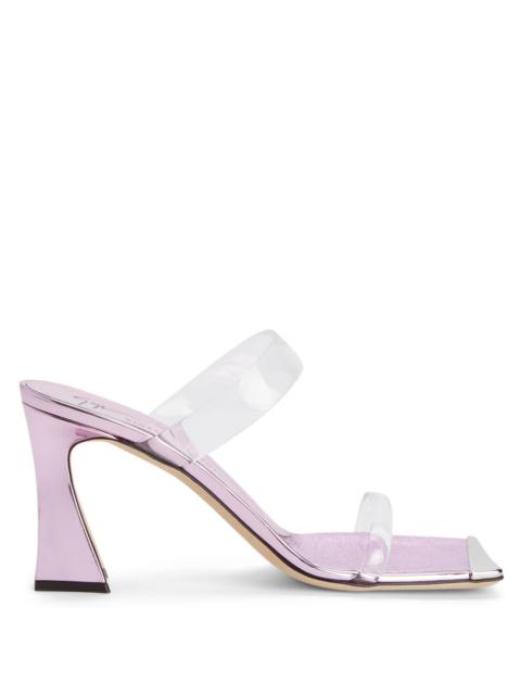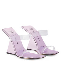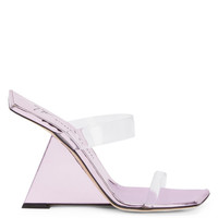 Product Details These pink mirror-effect synthetic fabric mules feature clear PVC bands. The design is characterised by square shapes and a peculiar silhouette, infusing this shoe with an attractive futuristic appeal. Clear PVC Wedge covered in pink mirror-effect synthetic fabric (75% PU; 20% PL; 5% VI) 105 mm wedge Leather sole with logo Made in Italy