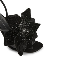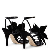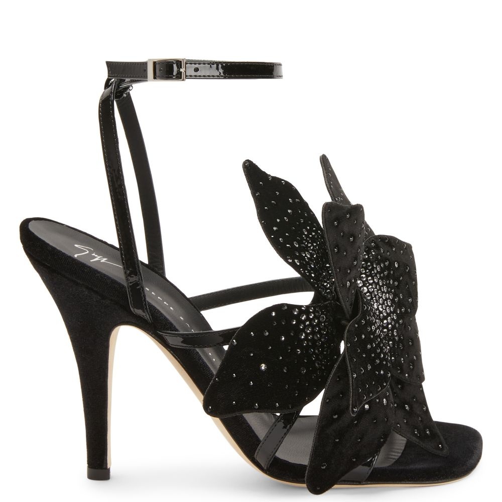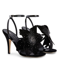 Product Details These sandals crafted from black patent leather feature a sumptuous velvet maxi flower embellished with a grey rhinestone embroidery, an ankle strap with adjustable closure with a silver metal buckle and stiletto heels covered in black velvet. Black patent leather Black velvet maxi flower with grey rhinestone embroidery Adjustable ankle strap with silver metal buckle Heel covered in black velvet 105 mm heel Leather sole with logo Made in Italy