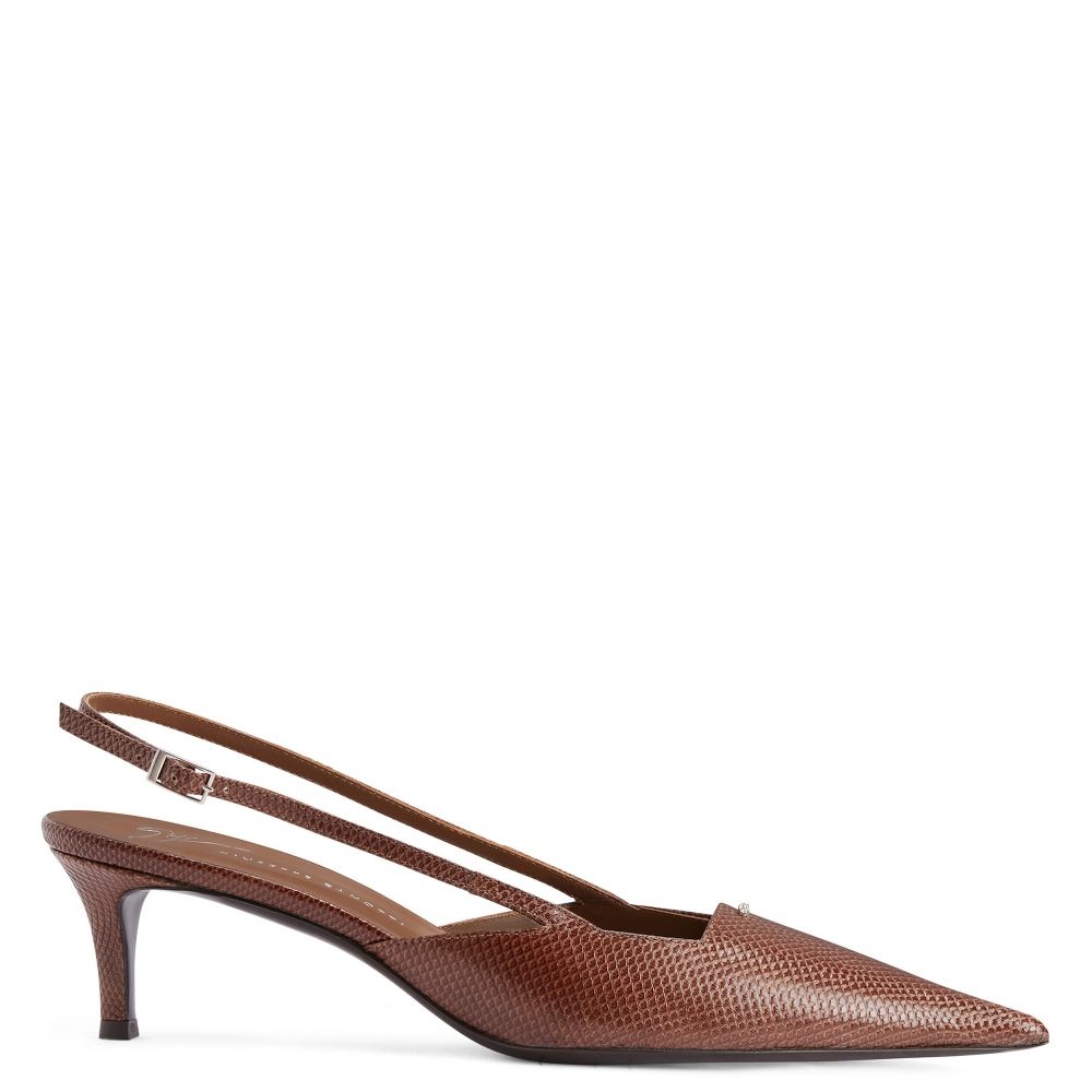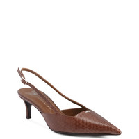 Product Details Pointed-toe slingback pumps in reptile-print leather with square topline, metal stitch detail on the upper, buckle-adjustable rear strap and kitten heel. - Brown reptile-print leather - Silver-coloured metal accessory with crystal-coloured rhinestone embroidery and silver-coloured metal buckle - 50 mm-high heel. - Brown leather sole with logo ORIGIN: ITALY COLOR: BROWN
