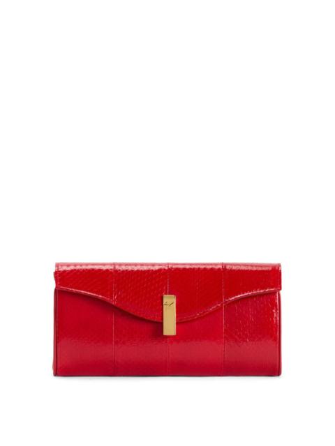 Product Details Clutch bag in reptile-print leather with branded metal closure, chain shoulder strap, pocket and inner card slots. - Light brown reptile-print leather - Branded golden metal closure - Golden metal chain shoulder strap - Leather and fabric interior with card slots and pocket - Size: 230 mm x 120 mm x 30 mm ORIGIN: ITALY COLOR: BROWN