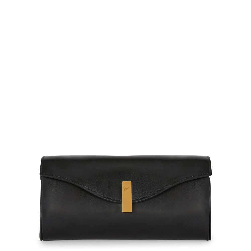 Product Details Clutch bag in leather with branded metal closure, chain shoulder strap, pocket and inner card slots. - Black leather - Branded golden metal closure - Golden metal chain shoulder strap - Leather and fabric interior with card slots and pocket - Size: 230 mm x 120 mm x 30 mm ORIGIN: ITALY COLOR: BLACK