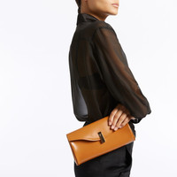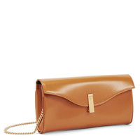 Product Details Clutch bag in leather with branded metal closure, chain shoulder strap, pocket and inner card slots. - Tan leather - Branded golden metal closure - Golden metal chain shoulder strap - Leather and fabric interior with card slots and pocket - Size: 230 mm x 120 mm x 30 mm ORIGIN: ITALY COLOR: BROWN