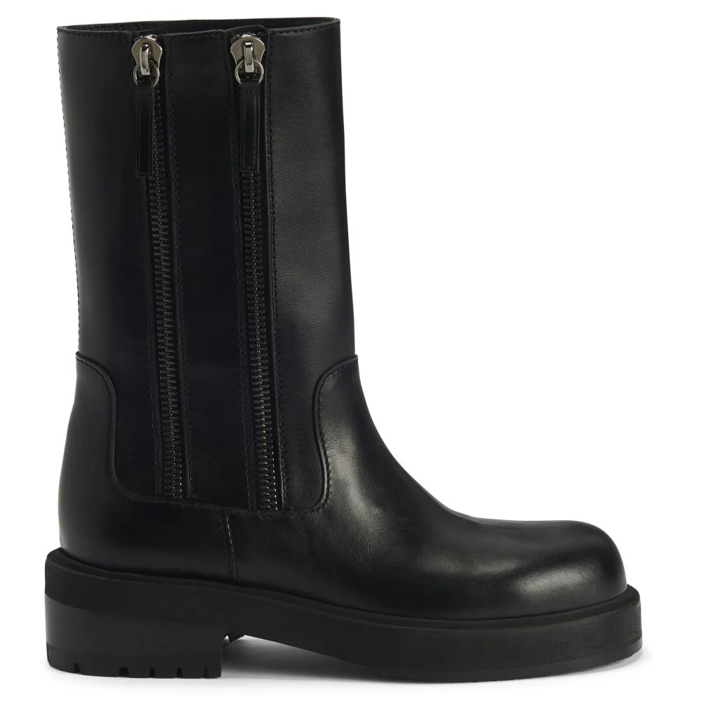 Product Details Leather calf-length boots with two outer zips and one-piece sole. - Black leather - Gunmetal grey double zip - Heel height: 50 mm - One-piece black rubber sole with logo ORIGIN: ITALY COLOR: BLACK