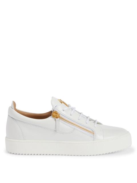Product Details These low-top sneakers, crafted from glossy white leather with matching cotton laces, feature a golden rubberised 'Signature' detail on the tongue and matching side zippers on the upper. Matching rubber soles give the design a perfect finish. - Men's sneakers - Glossy white leather - Golden metal 'Signature' hardware - White cotton laces - Golden metal zippers - White rubber sole with logo - Made in Italy ORIGIN: ITALY COLOR: WHITE