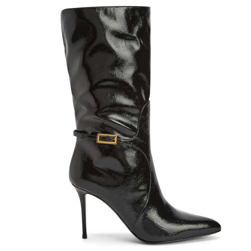 Product Details These pointed-toe mid-calf boots, crafted from patent-effect black synthetic fabric, feature a golden metal buckle strap at the ankle and are complete with matching covered stiletto heels. Patent-effect black synthetic fabric Golden metal buckle detail on strap 90 mm heel Heel covered in patent-effect black synthetic fabric Black leather sole with logo Made in Italy