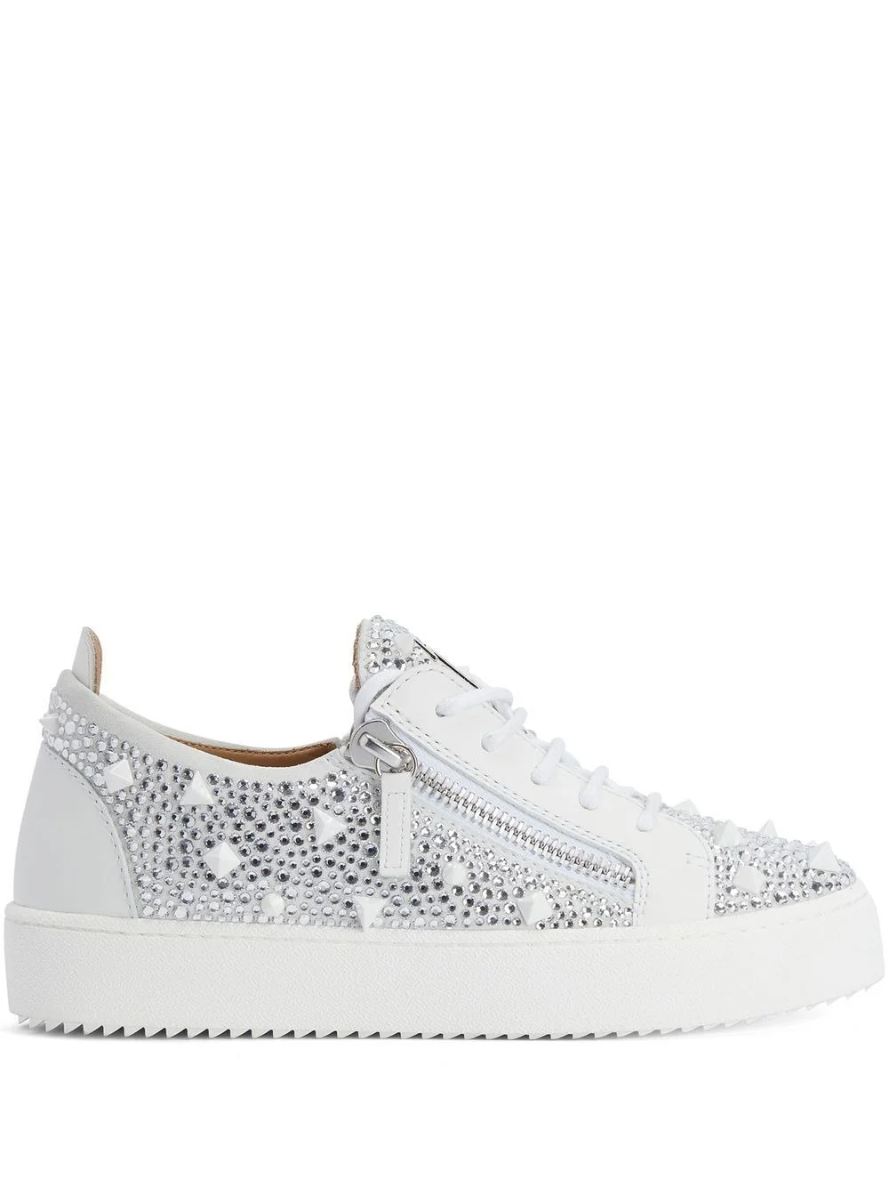 Gail crystal studded low-top sneakers white leather/suede crystal embellishment stud detailing round toe front lace-up fastening logo plaque at the tongue decorative zip detailing branded insole flat rubber sole Made in Italy Composition Outer: Suede 100%, Leather 100%, Rhinestone 100% Sole: Rubber 100% Lining: Leather 100%
