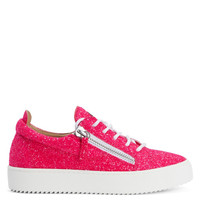 Product Details Low-top sneakers crafted from fuchsia glitter fabric with white cotton laces, featuring a silver metal 'Signature' detail on the tongue and silver side zippers fastenings on the upper; a white rubber sole gives the design a perfect finish. Fuchsia glitter fabric Silver metal 'Signature' detail White cotton laces White rubber sole with logo Made in Italy