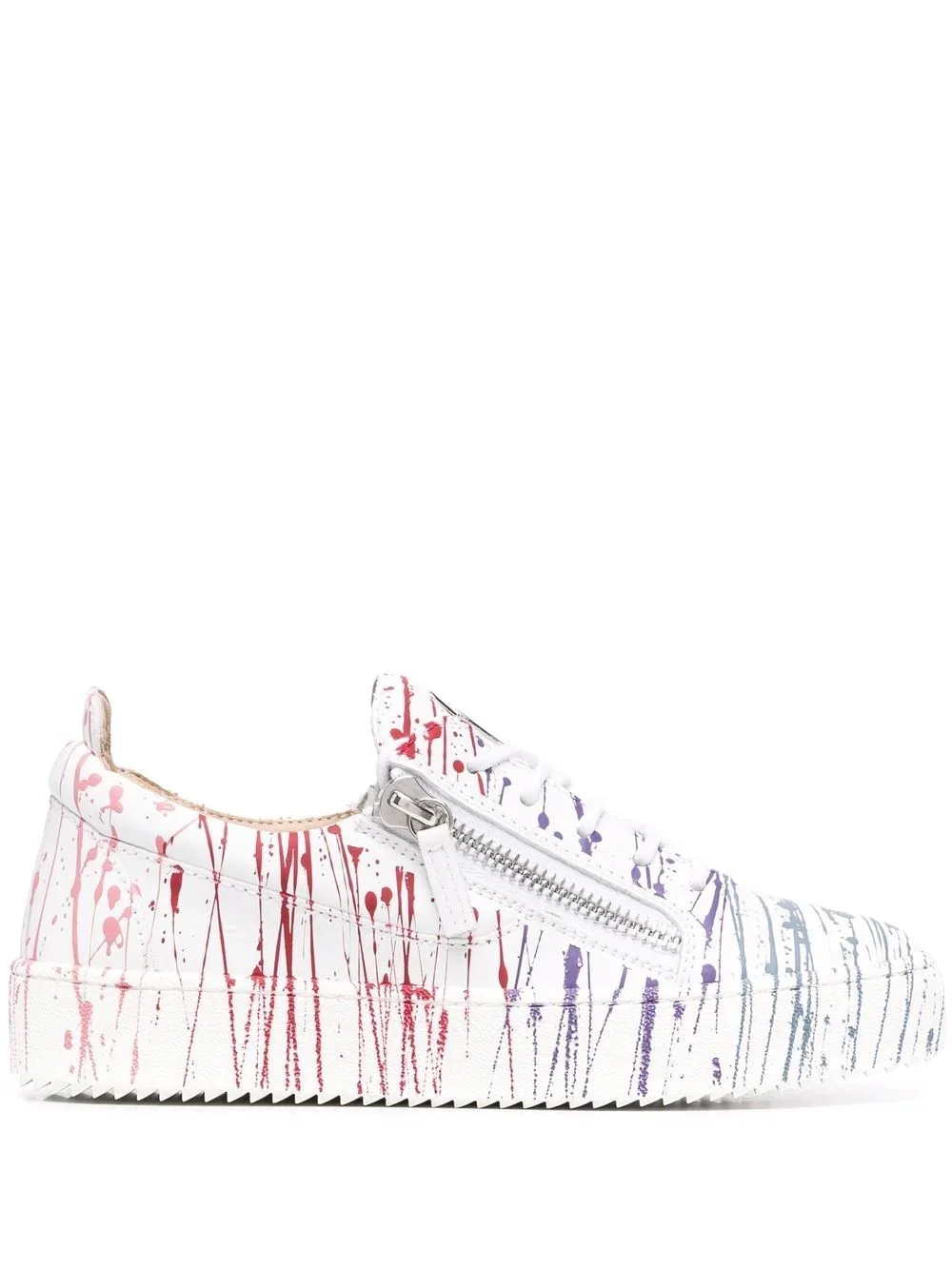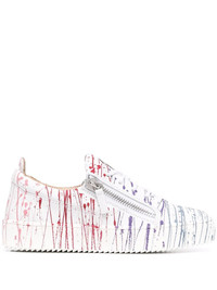 Frankie paint-splatter sneakers Embodying Italian craftsmanship at its finest, Giuseppe Zanotti's AW21 collection uses the house's heritage as a foundation for their playful and streetwear-inspired sneaker line. The Frankie is introduced in a multicolour plaint-splatter iteration, fastening at the side with silver-tone zips. Made in Italy Composition Leather 100%