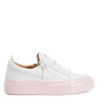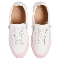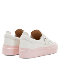 Product Details Low-top sneakers crafted from white leather with a pink gel coating on upper and sole, featuring a white rubberised 'Signature' detail on the tongue and matching plastic side zippers on the upper; a white rubber sole gives the design a perfect finish. White leather Pink gel coating on upper and sole White rubberised metal 'Signature' White cotton laces White plastic zippers White rubber sole with logo and pink gel coating on the upper Made in Italy