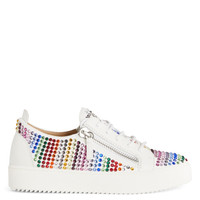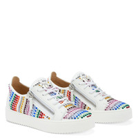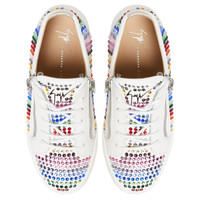 Product Details Low-top sneakers crafted from white synthetic fabric with suede effect and leather with matched cotton laces, featuring multicoloured rhinestone embroidery, a silver metal 'Signature' detail on the tongue and silver side zipper fastenings on the upper; a white rubber sole completes the design of this model. White synthetic fabric with suede effect (50% NY; 50% PU) and white leather Silver metal 'Signature' detail White cotton laces Multicoloured rhinestone embroidery White rubber sole with logo Made in Italy