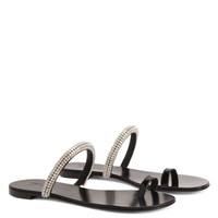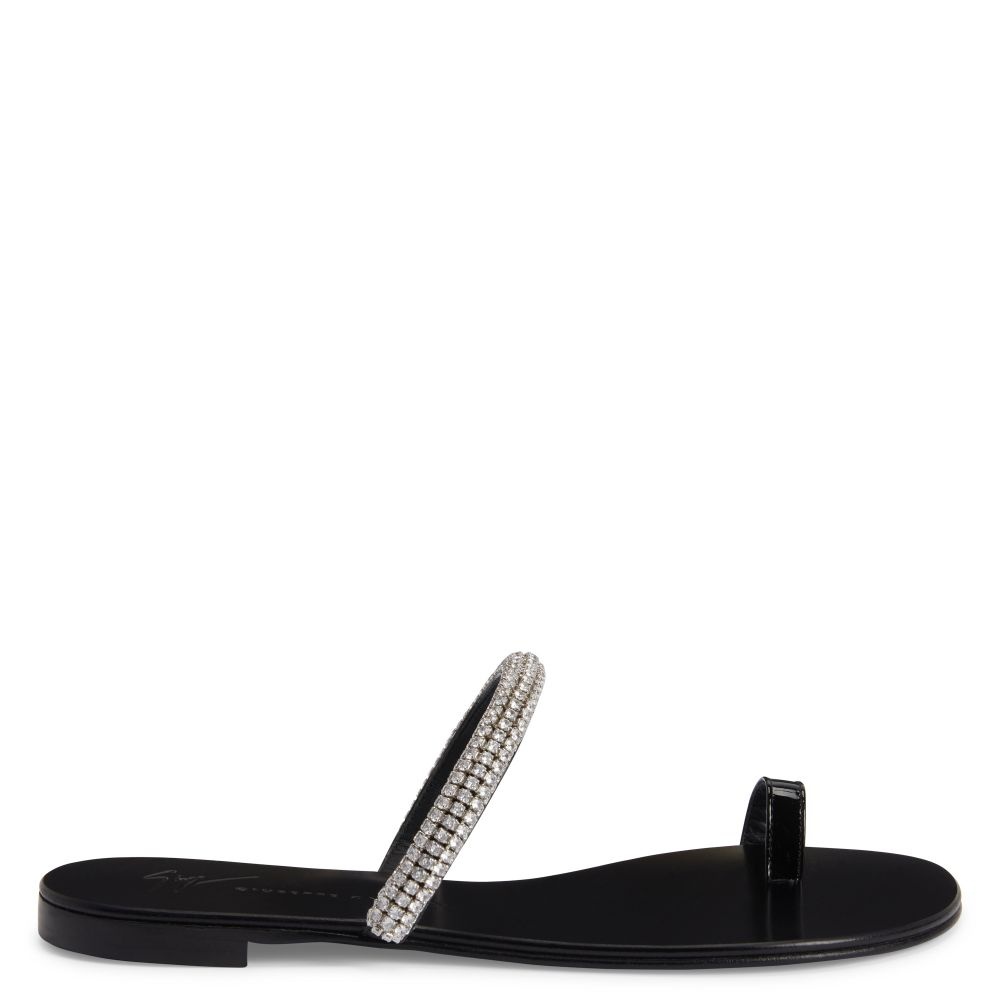 Product Details Flat thong sandals crafted from black patent leather with matching glossy leather soles, featuring thong straps embellished with silver metal hardware with crystal rhinestones. - Black patent leather - Silver metal hardware with crystal rhinestones - 10 mm heel - Glossy black leather sole with logo - Made in Italy ORIGIN: ITALY COLOR: BLACK