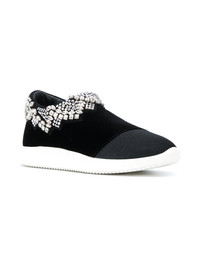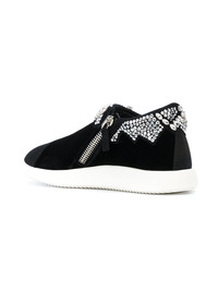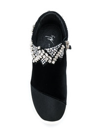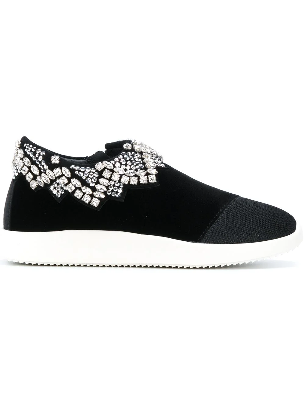 Gemma sneakers Known for his perfectly crafted streetwear sneakers, Giuseppe Zanotti creates opulent pieces that are the height of sports luxury. Black leather and velvet Gemma sneakers from Giuseppe Zanotti featuring a round toe, crystal embellishments, a flat rubber sole and a brand embossed insole. Made in Italy Composition Sole: Rubber 100% Lining: Calf Leather 100% Outer: Calf Leather 100%, Velvet 100% SIZE & FIT Measurement Sole height 0.59 in(1.5 cm) HEEL 0.78 in(2 cm)