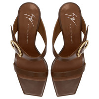 Product Details Open-toe mule sandals in leather metal maxi buckle and block heel. - Brown leather - Light golden metal buckle - 90 mm-high heel. - Brown leather sole with logo ORIGIN: ITALY COLOR: BROWN