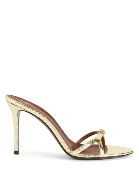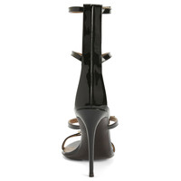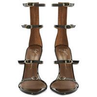 Product Details Patent leather sandals with thin straps, metal buckles and stiletto heel. - Black patent leather - Light golden metal buckles - 105 mm-high heel. - Brown leather sole with logo ORIGIN: ITALY COLOR: BLACK