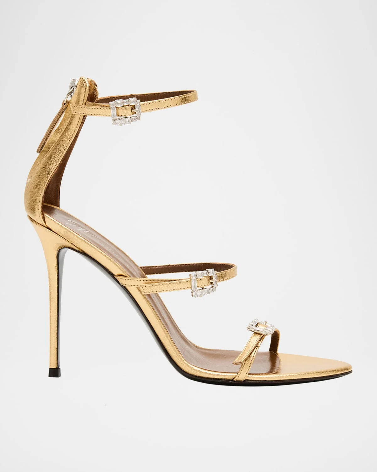 Giuseppe Zanotti metallic leather sandals with crystal trim 4.25 in / 105 mm stiletto heel Open toe Dual buckle strap upper Adjustable ankle strap Zip closure for easy on/off Leather outsole Lining: Leather Spot clean Made in Italy
