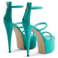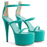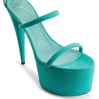 Product Details These open-toe mules, crafted from aquamarine suede, feature three thin straps, a zipper closure on the back of the heel, matching stiletto heels and platform and a black leather sole with logo. Three aquamarine suede straps Zipper on the back 60 mm platform covered in aquamarine suede 150 mm heel covered in aquamarine suede Leather sole with logo Made in Italy