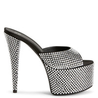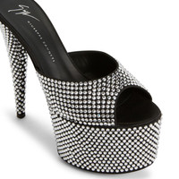 Product Details This open-toe mule sandal in black synthetic satin features rhinestone embroidery all over, and a tonal covered stiletto heel and platform. Black satin-effect synthetic fabric 150mm heel Rhinestones all over Platform height 60 mm Leather sole with logo Made in Italy