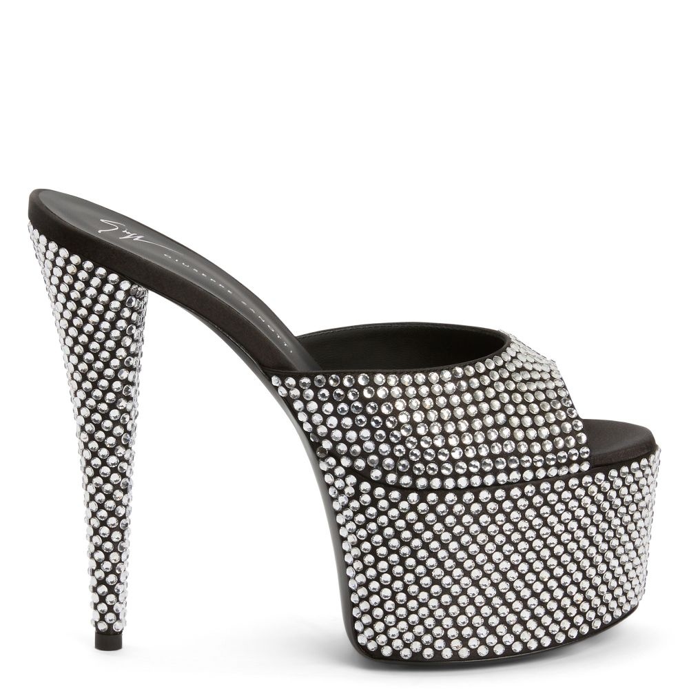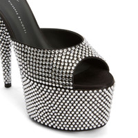 Product Details These open-toe mules crafted from black synthetic satin feature an all-over crystal-coloured rhinestone embroidery, matching covered platforms and stiletto heels. Black synthetic satin Crystal-coloured rhinestone embroidery Black synthetic satin 60 mm platform with crystal-coloured rhinestone embroidery Matching covered 150 mm heel Black leather sole with logo Made in Italy