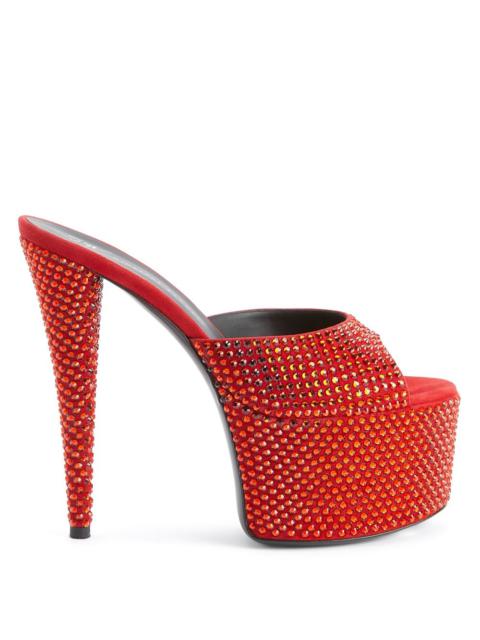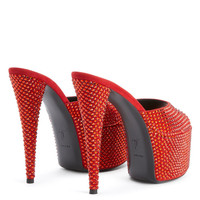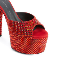 Product Details These open-toe mules, crafted from red suede, are embellished with a matching all-over rhinestones embroidery and feature matching covered stiletto heels and platforms and a leather sole. Red suede Red rhinestones embroidery Red suede 60 mm platform with matching rhinestones embroidery Red suede 150 mm heel with matching rhinestones embroidery Black leather sole with logo Made in Italy