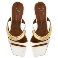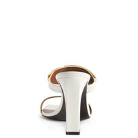 Product Details Open-toe mule sandals in leather with hammered metal accessory and block heel. - Ivory-white leather - Hammered golden metal accessory - 90 mm-high heel. - Brown leather sole with logo ORIGIN: ITALY COLOR: WHITE