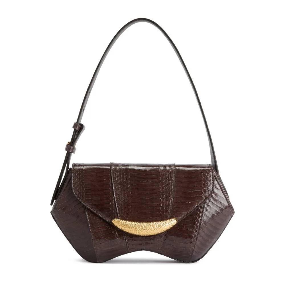 Product Details Compact shoulder bag in Elaphe Carinata snakeskin with hammered-effect metal closure, rigid reptile skin shoulder strap and inner pocket. - Material: 100% elaphe carinata reptile leather - Lining: Fabric ORIGIN: ITALY COLOR: BROWN