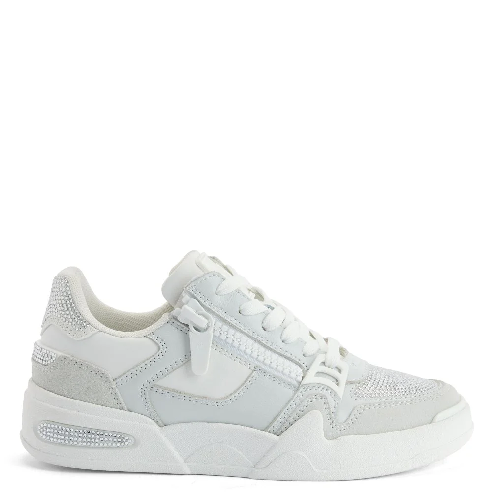 Product Details Low-top lace-up sneakers in leather and suede leather with two side zippers and rubber sole. - Womens sneakers - White leather and gray suede leather - Crystal-colored rhinestone embroidery - White rubber-topped accessories, lace loop detail and white lacing - White zippers - White rubber sole with crystal-colored rhinestone detailing and logo ORIGIN: ITALY COLOR: WHITE