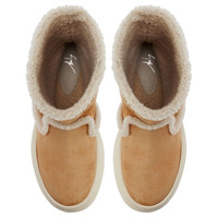 Product Details Suede bootie sneakers with shearling lining and rubber platform sole. - Upper: 85% calfskin suede, 15% calfskin - Lining: merino - Insole: merino - Sole: Rubber ORIGIN: ITALY COLOR: BEIGE