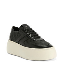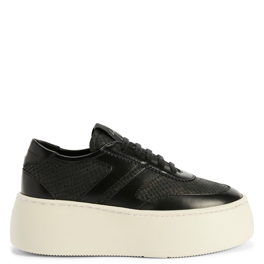 Product Details Low-top lace-up sneakers in leather and python-print leather with rubber maxi sole. - Women's sneakers - Black python-print leather and leather - Black fabric label with silver Signature - Light golden metal accessory and hot-stamped logo lettering on the upper at the back - Black laces - Off-white rubber sole with logo ORIGIN: ITALY COLOR: BLACK