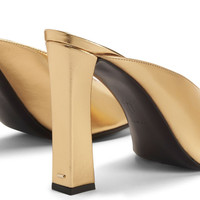Product Details Minimalist open-toe mule sandals in laminated leather with square toe and topline and low heel with metal detail. - Golden laminated leather - Light gold metal detail on the heel - Heel height: 105 mm. - Heel covered in golden laminated leather - Brown leather sole with logo - Made in Italy ORIGIN: ITALY COLOR: GOLD