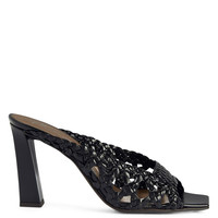 Product Details Clean-cut, open-toe mule sandals in woven leather with square toe and topline and block heel with metal stitch detail. - Black woven leather - 90 mm-high heel with light golden metal accessory - Brown leather sole with logo ORIGIN: ITALY COLOR: BLACK