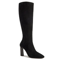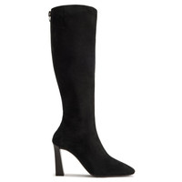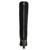 Product Details Knee-high boots in suede leather with rounded toe, rear zipper and leather-covered block heel. - Black suede leather - Zipper and zipper pull in silver-colored metal on the back - 90 mm-high heel covered in brown leather - Brown leather sole with black non-slip rubber and logo ORIGIN: ITALY COLOR: BLACK