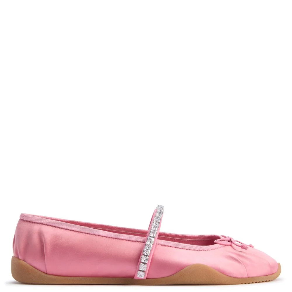 Product Details Mary Jane ballet flats in satin with darts, bow, rhinestone band and honey-colored rubber sole. - pink silk satin - crystal-colored rhinestones - honey-colored rubber sole ORIGIN: ITALY COLOR: LIGHT_PINK