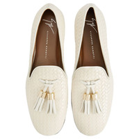 Product Details Grosgrain-trimmed loafers in woven-print leather with leather tassels and metal detail. - Ivory-white woven-print leather with ivory-white leather edge - Ivory-white leather tassels with golden metal accessory - 05 mm-high heel - Brown leather sole with logo ORIGIN: ITALY COLOR: BEIGE