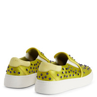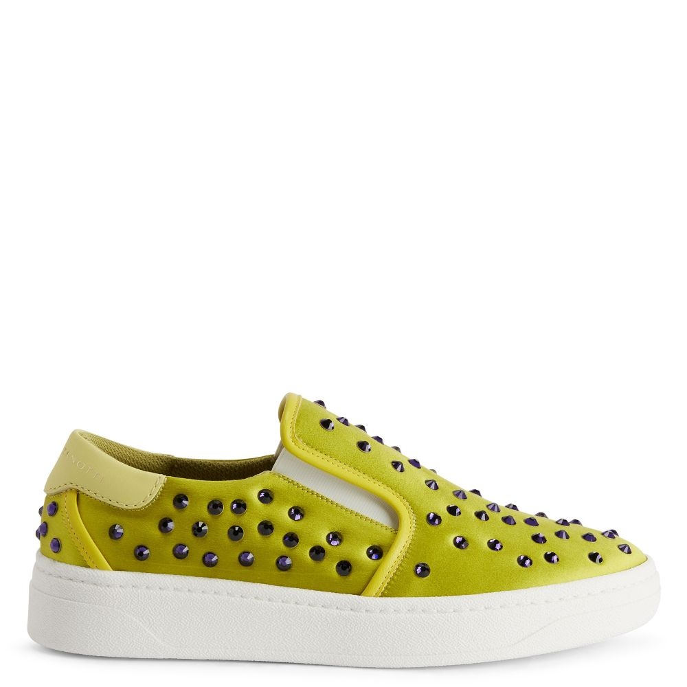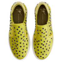 Product Details These slip-on sneakers, crafted from acid-green synthetic fabric and leather with white rubber soles and matching technical fabric inner lining, feature a debossed golden ‘GZ’ logo on the back of the upper and are embellished with an all-over purple rhinestones embroidery. Women's sneakers Acid-green synthetic fabric and acid-green leather Purple rhinestones embroidery on upper Debossed golden 'GZ' logo on the back Green technical fabric inner lining White rubber sole with logo Made in Italy