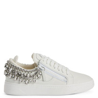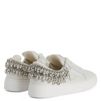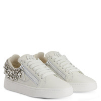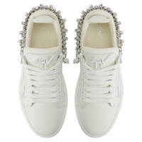 Product Details Low-top sneakers, crafted from white leather and embellished with silver metal hardware with crystal rhinestones on the back of the upper, featuring a white lacquered metal 'Signature' detail on the tongue and white plastic side zipper fastenings; a matching rubber sole completes the design of this model. Women's sneakers White leather Silver metal hardware with crystal rhinestones White lacquered metal 'Signature' White cotton laces White rubber sole with logo Made in Italy