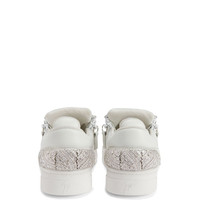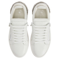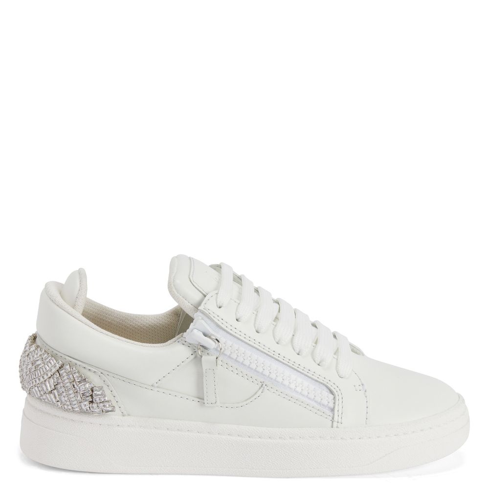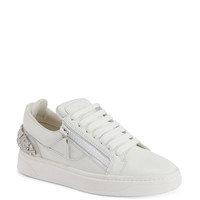 Product Details Low-top lace-up sneakers in leather with crystal-coloured rhinestoned accessory on the heel, two tonal side zips and rubber sole. - Women's sneakers - White leather - Silver-coloured metal accessory with crystal-coloured rhinestones on the heel - Hot-stamped Signature on the label - White laces - White rubber sole with logo ORIGIN: ITALY COLOR: WHITE