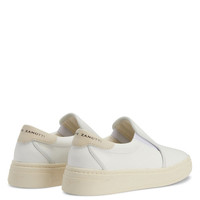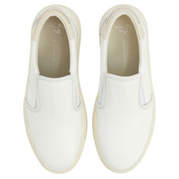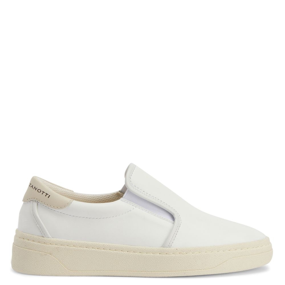 Product Details Slip-on leather sneakers with two-tone detail and rubber sole. - Women's sneakers - Off-white leather - Engraved gunmetal grey applique on the upper at the back - White technical fabric inner lining - Off-white rubber sole with logo ORIGIN: ITALY COLOR: WHITE