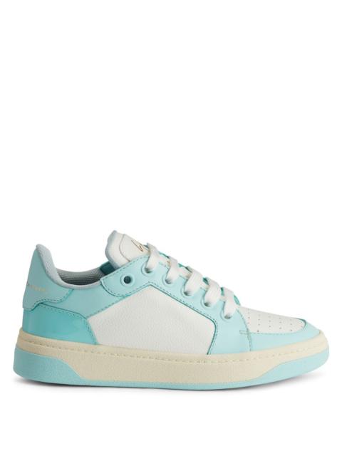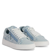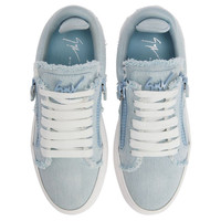 Product Details Low-top lace-up sneakers in denim with two tonal side zips and rubber sole. - Women's sneakers - Light-blue frayed denim-like cotton fabric - Light-blue lacquered metal 'Signature' - White cotton laces - White rubber sole with logo ORIGIN: ITALY COLOR: BLUE