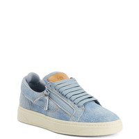 Product Details Low-top lace-up sneakers in denim-print suede and leather with two tonal side zips and rubber sole. - Women's sneakers - Light blue denim-print suede and natural-coloured leather - Hot-stamped Signature on the label - Light blue laces - Light blue zips - Off-white rubber sole with logo ORIGIN: ITALY COLOR: BLUE
