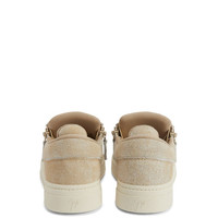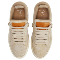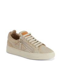Product Details Low-top lace-up sneakers in denim-print suede and leather with two tonal side zips and rubber sole. - Women's sneakers - Beige denim-print suede and natural-coloured leather - Hot-stamped Signature on the label - Beige lacing - Beige zip - Off-white rubber sole with logo ORIGIN: ITALY COLOR: BEIGE