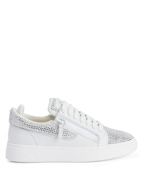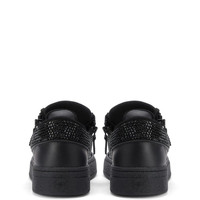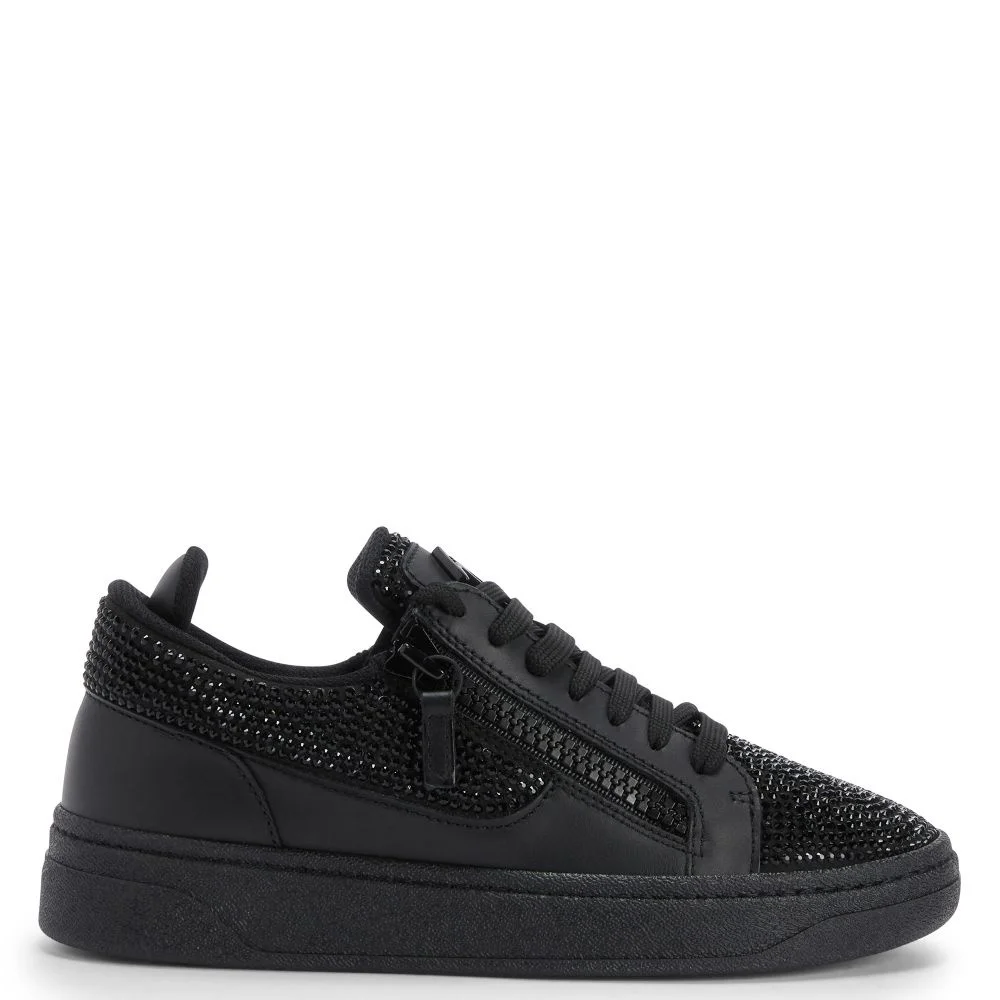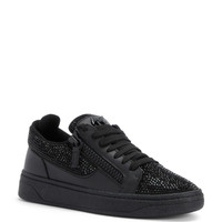 Product Details Low-top lace-up sneakers in leather and suede-effect fabric with rhinestone embroidery, two side zips and rubber sole. - Women's sneakers - Black leather and suede-effect fabric - Black rhinestone embroidery all over the upper - Metal Signature with black lacquer finish - Black lacing - Black rubber sole with logo ORIGIN: ITALY COLOR: BLACK