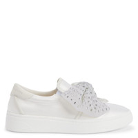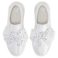 Product Details These slip-on sneakers, crafted in off-white synthetic satin and leather, feature contrasting white rubber soles and matching technical fabric inner lining and are embellished with a white synthetic chiffon bow appliqué with crystal baguette rhinestones on the upper and with a golden ‘GZ’ debossed logo on the back of the upper. Women's sneakers White synthetic satin and off-white leather Off-white synthetic chiffon bow appliqué with crystal baguette rhinestones Debossed silver 'GZ' logo on the back White technical fabric inner lining White rubber sole with logo Made in Italy
